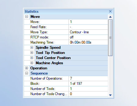 Displays detailed information about your toolpath like: Machining time, Spindle speed, Tool tip position, Tool center position, machining angles and more.