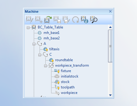 Complete machine definition tree with its components. Interactive and color coded highlight to verify components direction, checking groups and more.