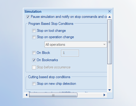 Customize how your simulations with run with options to: Stop on tool change, Stop on operations change, stop on block number and more.