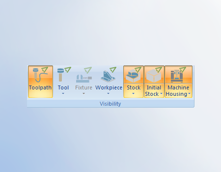 Control the display of simulation components. Toggle on and off toolpath, tool, fixture, workpiece, stock, initial stock and machine housing. Show, opaque, transparent and hide options allowing users to fully customize what they display and in what form.