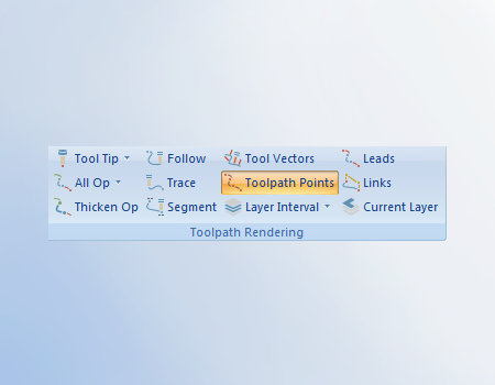 Multiple display options for toolpath: Tool tip, All ops, Thicken op, Follow, Trace, Segment, Tool vectors, Toolpath points. Layer interval and more.