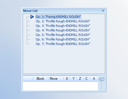 Lists the operations that will be simulated. Jump to toolpaths you want to focus on by clicking on an operation in the move list.